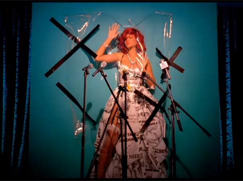 Paulus’ work included a woman in a red dress held against a wall via plastic wrapping with black tape in X-marks over it.